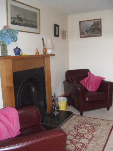 Downstairs - Larger sitting/dining room with leather sofa & 2 armchairs, Table with seating for 4, TV, Dvd & a coal fire. Well equipped kitchen with electric cooker, microwave & fridge. Twin bedroom. Toilet